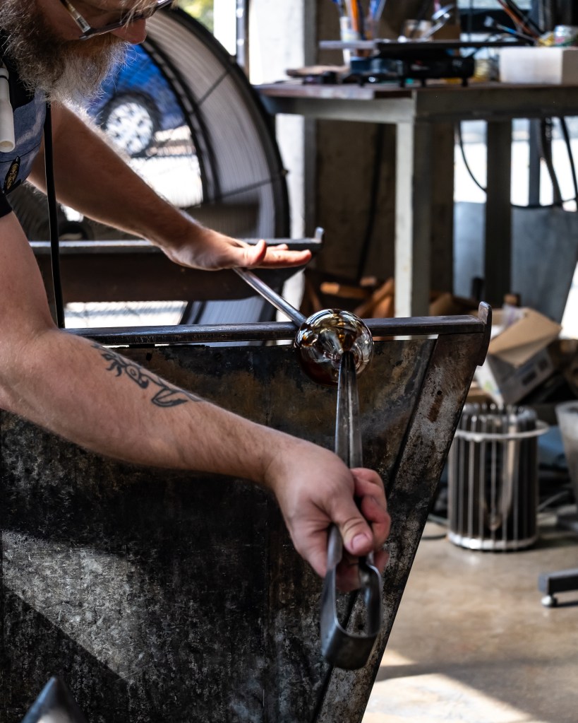 The whole process to build and shape my chosen piece took maybe 15 minutes, though some were longer. John was patient and gracious as I watched and asked questions throughout. After my glass was complete, it was whisked away to cool in safety—something to keep in mind if you’re just popping in. The glass needs a day or two to rest before you can take it home, and I won’t see mine in its final form until someone goes to retrieve our wares later this week.