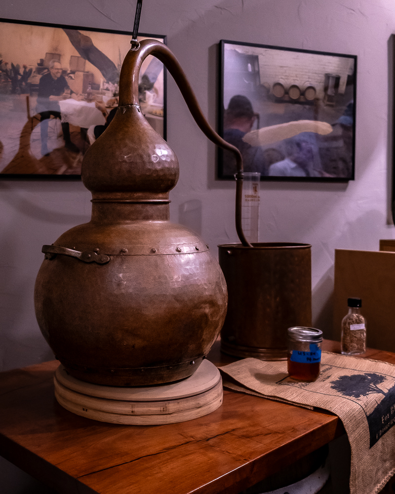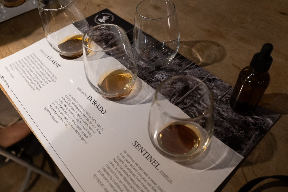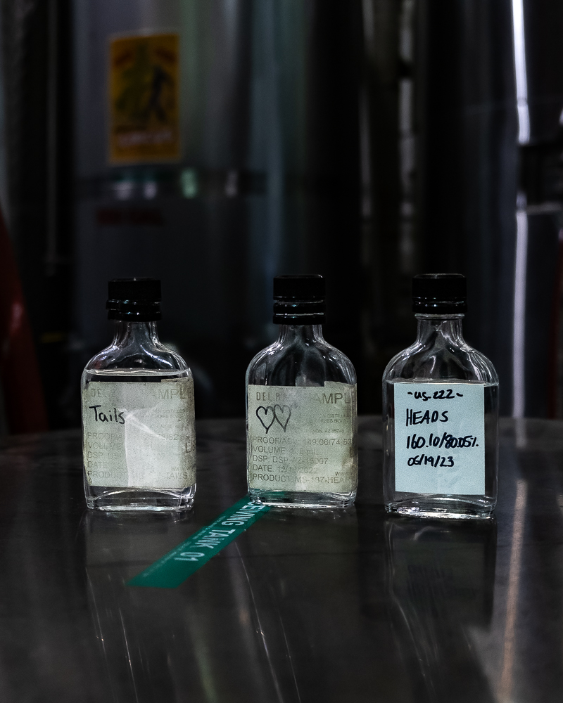 Along the way, we learned of the Samuels’ family’s whisky legacy, which stretches all the way back to Scotland and inspired the brand’s use of the e-exclusive “whisky” on their products. Winding through the black-walled buildings, Chad explained how Mr. Samuels pivoted from a successful career in Louisville to purchase the already-established farm and distillery in rural Loretto. The still-in-use still house is the oldest in the country and home to a column still standing 5 stories tall.